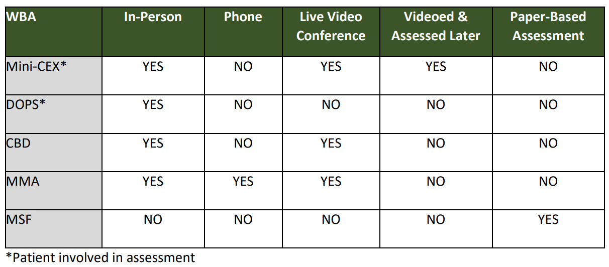 While some WBAs must be completed in-person, several can be completed remotely by phone, video conference or can be videoed and assessed later as per the below table.
